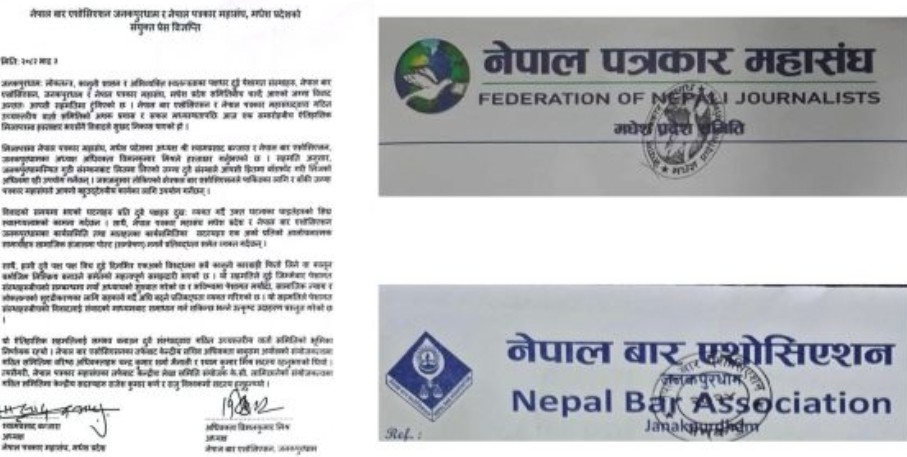 दुवै संस्थाद्वारा गठित उच्चस्तरीय वार्ता समितिको अथक प्रयास र सफल मध्यस्थतापछि मंगलवार ऐतिहासिक मिलापत्रमा हस्ताक्षर गरिएको हो। सम्झौतामा पत्रकार महासंघ, मधेश प्रदेशका अध्यक्ष श्यामप्रसाद बन्जारा र नेपाल बार एसोसिएसन, जनकपुरधामका अध्यक्ष अधिवक्ता विमलकुमार मिश्रले हस्ताक्षर गर्नुभएको छ।