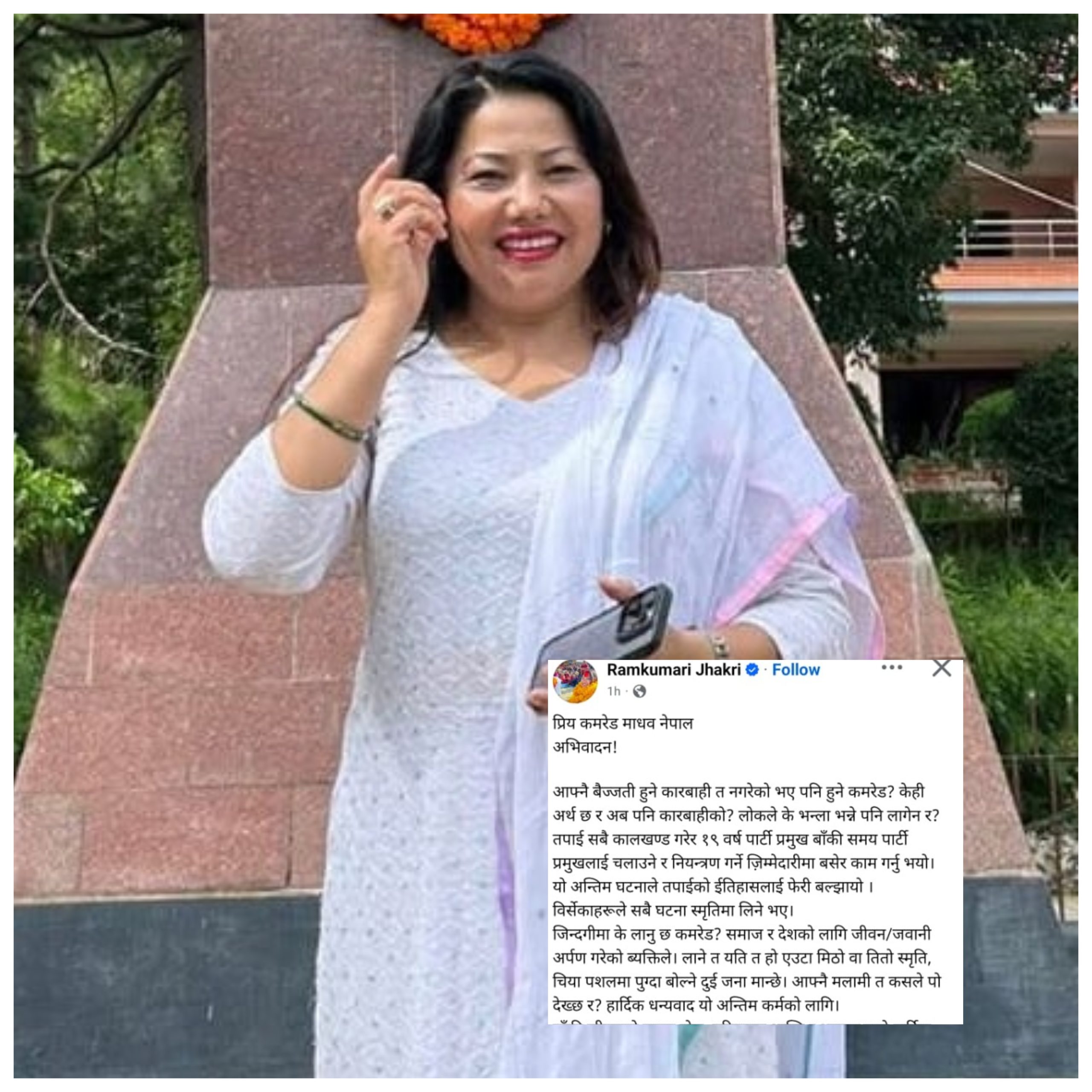 उनले लेखेकी छन्, “आफ्नै बैज्जती हुने कारबाही त नगरेको भए पनि हुने कमरेड? केही अर्थ छ र अब पनि कारबाहीको? लोकले के भन्ला भन्ने पनि लागेन र?” भन्दै माधव नेपालले पार्टी प्रमुखको हैसियतमा लामो समय नेतृत्व सम्हालेको स्मरण गराएकी छन्।