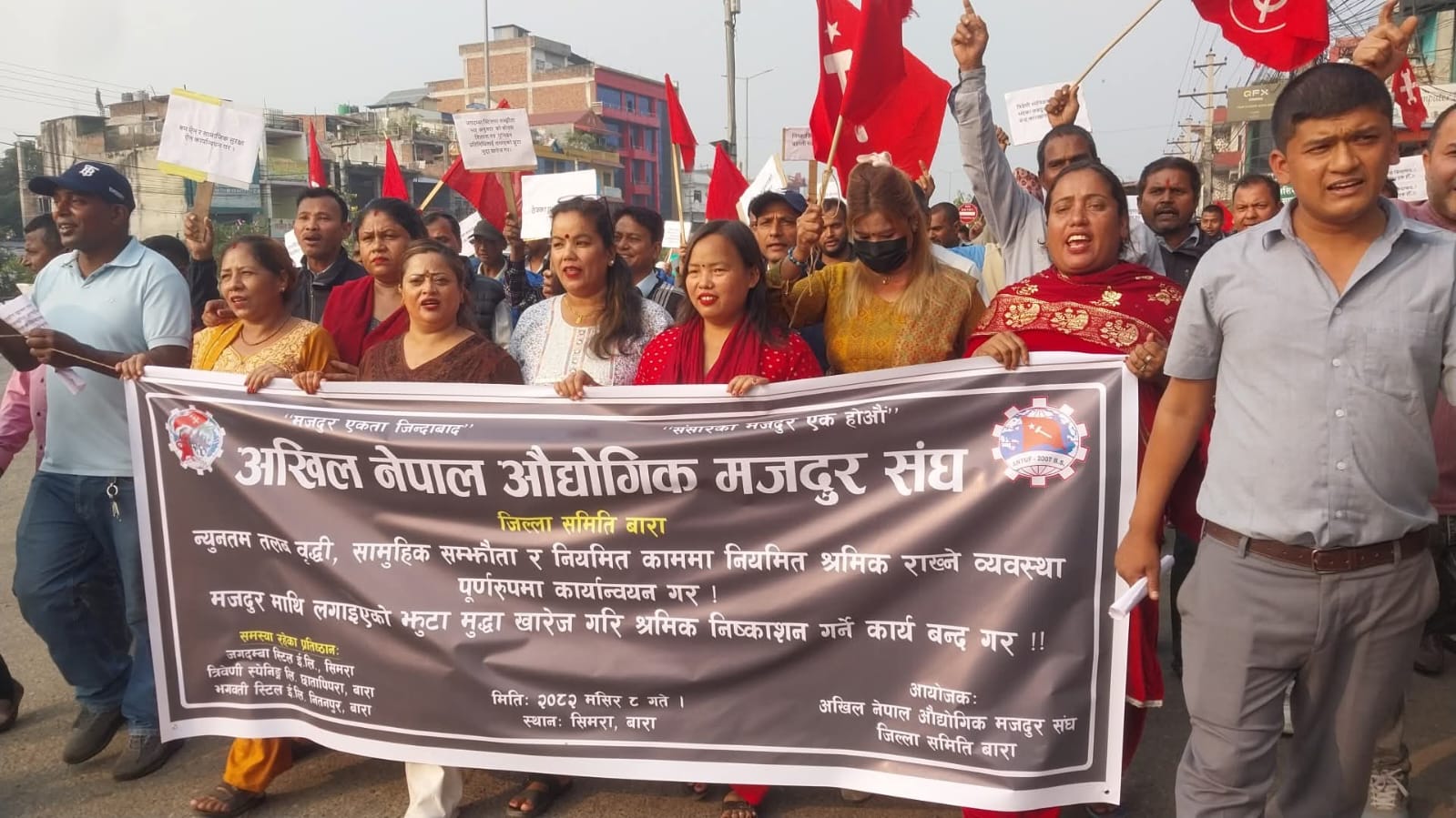 बाराको सिमरामा अव्यवस्थित जगदम्बा स्टिल त्रिवेणी सिमपेक्स र हुलास स्टिल लगायतका मजदुरहरू आन्दोलनमा उत्रिएका छन्। अखिल नेपाल अधिक मजदुर सङ्घ जिल्ला समिति बाराको अगुवाइमा मजदुरहरूले आज आफ्ना माग पूरा गराउन सिम्रा बजारमा प्रदर्शनपछि इलाका प्रशासन कार्यालय सिम्रामा ज्ञापनपत्र बुझाएका छन्। मजदुरहरूले सरकारले साउन १ गतेदेखि लागू हुनेगरी दीर्घ गरेको न्यूनतम तलब लागू गर्नुपर्ने त्रिवेणी स्पेनिङ मिलमा श्रमिकमाथि भएको कारवाही फिर्ता गरी कारखाना सञ्चालन गर्ने वातावरण बनाउनुपर्ने सिम्रा स्थित जगदम्बा स्टिलमा सम्झौता अनुसार बोनस उपलब्ध गराई श्रमिकमाथिको झुठा मुद्दा फिर्ता गर्नुपर्ने प्रतिष्ठान भित्र प्रहरी हस्तक्षेप बन्द गर्नुपर्ने लगायतका माग राखेका छन् । त्यसैगरी मजदुरहरूले तलब वृद्धि सामूहिक सम्झौताको कार्यान्वयन नियमित काममा नियमित श्रमिक राख्ने व्यवस्था लागू गर्न माग गरेका छन्। साथै उनीहरूको मधुरहरूमाथि कारखाना व्यवस्थापन पक्षले लगाएको झुठा मुद्दा खारेज निष्कासित मजदुरलाई पूर्णवाली बन्द उद्योग पूर्ण सञ्चालन कार्यान्वयन गर्न तथा श्रम ऐन र सामाजिक सुरक्षा ऐन लागु गर्न पनि माग गरेका छन् । मजदुरहरूको ध्यानकर्षण पत्र बुझ्दै इलाका प्रशासन कार्यालय सिमराका प्रमुख राजेन्द्रप्रसाद कडेलले मजदुरहरूको समस्याका विषयमा तत्कालै प्रमुख जिल्ला अधिकारीलाई जानकारी गराउने बताउनुभएको छ।