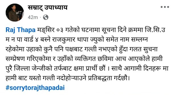 जेन्जीका बारा जिल्ला संयोजक सम्राट उपाध्यले मंसिर ३ गते सिम्रामा भएको घटनामा जोडेर आफूहरूको तर्फबाट असम्बन्धित व्यक्तिको नाममा समेत प्रहरीमा जाहिरी दिएकोमा क्षमा याचना गर्नुभएको छ । समाजिक सञ्जाल फेसबुकमा आज स्टाटस लेखेर उपाध्यले सो घटना स्थानीय एमाले कार्यकर्ता राजकुमार थापाको नाम परेकोमा क्षमा याचना गर्नुभएको हो। घटनामा राजकुमार थापाको कुनै पनि प्रकारको सघनता नभएको स्पष्ट भइसकेको छ। तर गलत सूचना सम्प्रेषणका कारण थापाको व्यक्तिगत छविमा आँच पुगेको महसुस गर्दै जेन्जीबारा परिवारको तर्फबाट पूर्ण रुपमा माफी माग्न चाहन्छौं। उपाध्यायले फेसबुकमा लेख्नुभएको छ साथै उहाँले आगामी दिनमा यस्ता गल्तीहरू नदोहोराउने प्रतिबद्धता पनि जनाउनुभएको छ। नेकपा एमालेका महासचिव शंकर पोखरेल र युवा नेता महेश बस्नेत सिम्रा विमानस्थल हुँदै बाराको परानपुरमा हुन लागेको कार्यक्रममा सहभागी हुन आउने क्रम मा विरोध प्रदर्शनको तयारीमा रहेका जेन्जीहरूलाई युवा सङ्घका कार्यकर्ताहरुले कुटपिट गरेपछि दुवै पक्ष बीच तनाव उत्पन्न भएको थियो । सोही घटनालाई लिएर एमालेका कार्यकर्ता थापासहित १० जनामाथि कारबाहीको माग गर्दै जेन्जीहरूले प्रहरीमा जाहेरी दिएका थिए। यसै बीच घटनामा सलगन्त भएका आरोपमा जितपुर सिम्रा उपमहानगरपालिकामा एमालेबाट निर्वाचित दुई जना वडा अध्यक्ष सहित पक्राउ परेका सबैले आज जिल्ला प्रशासन कार्यालय बाराले ५००० हजार धरौटी लिएर रिया गरेको छ