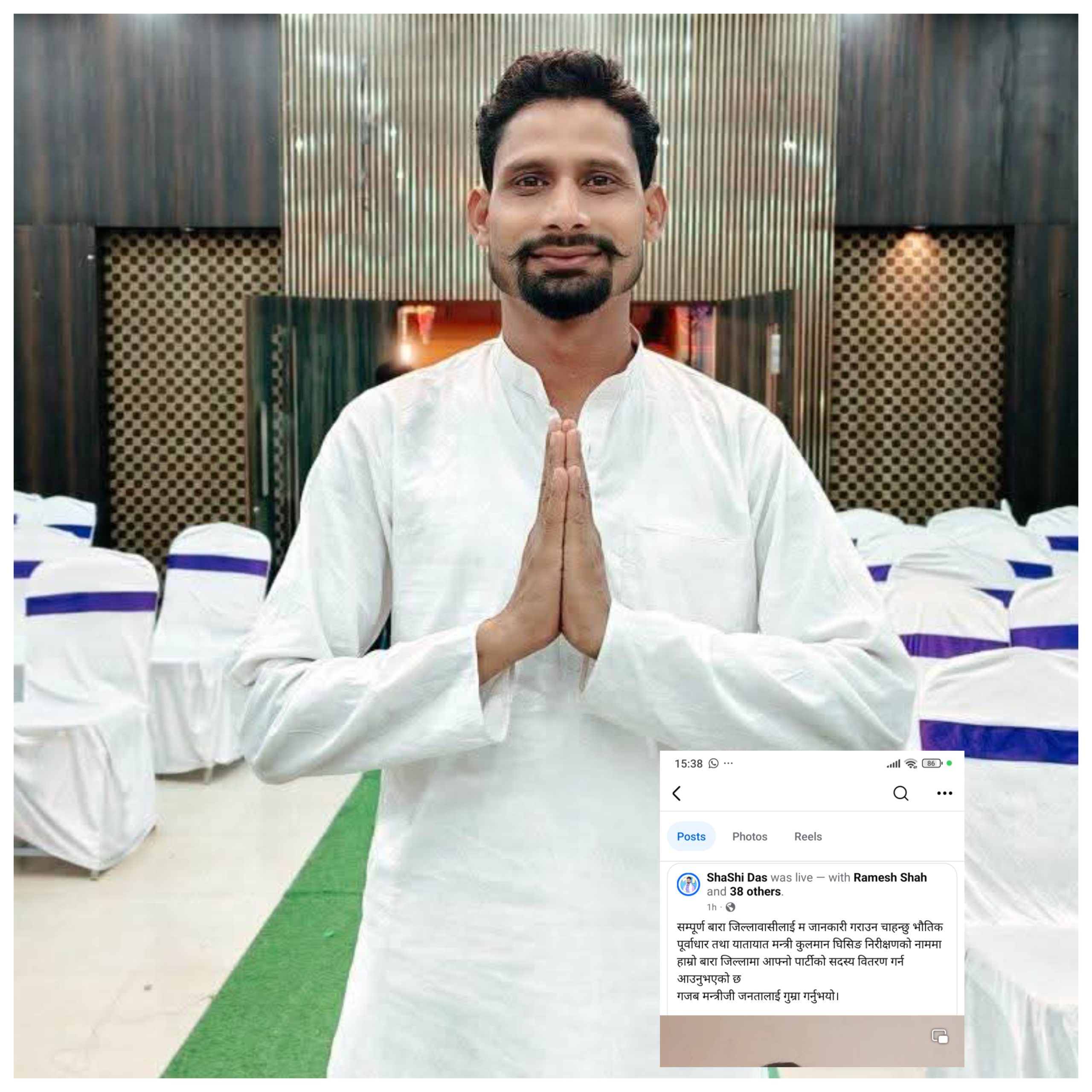 बारा जिल्लावासीलाई लक्षित गर्दै स्थानीय युवा शशी दासले सामाजिक सञ्जालमार्फत भौतिक पूर्वाधार तथा यातायात मन्त्री कुलमान घिसिङको हालैको जिल्लास्तरीय भ्रमणप्रति कडा आक्रोश व्यक्त गरेका छन्। दासका अनुसार “निरीक्षण” को नाममा मन्त्री घिसिङ बारा आइपुगे पनि वास्तविक उद्देश्य भने आफ्नै पार्टीको सदस्यता वितरण र संगठन विस्तार रहेको बताइएको छ।