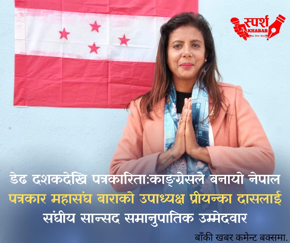 नेपाली काङ्ग्रेसले विगत १५ वर्षदेखि पत्रकारितामार्फत समाजलाई सुसूचित गर्दै आएकी नेपाल पत्रकार महासंघ बाराकी उपाध्यक्ष प्रीयन्का दासलाई संघीय प्रतिनिधि सभा तर्फ समानुपातिक सांसदको उम्मेदवार बनाएको छ।