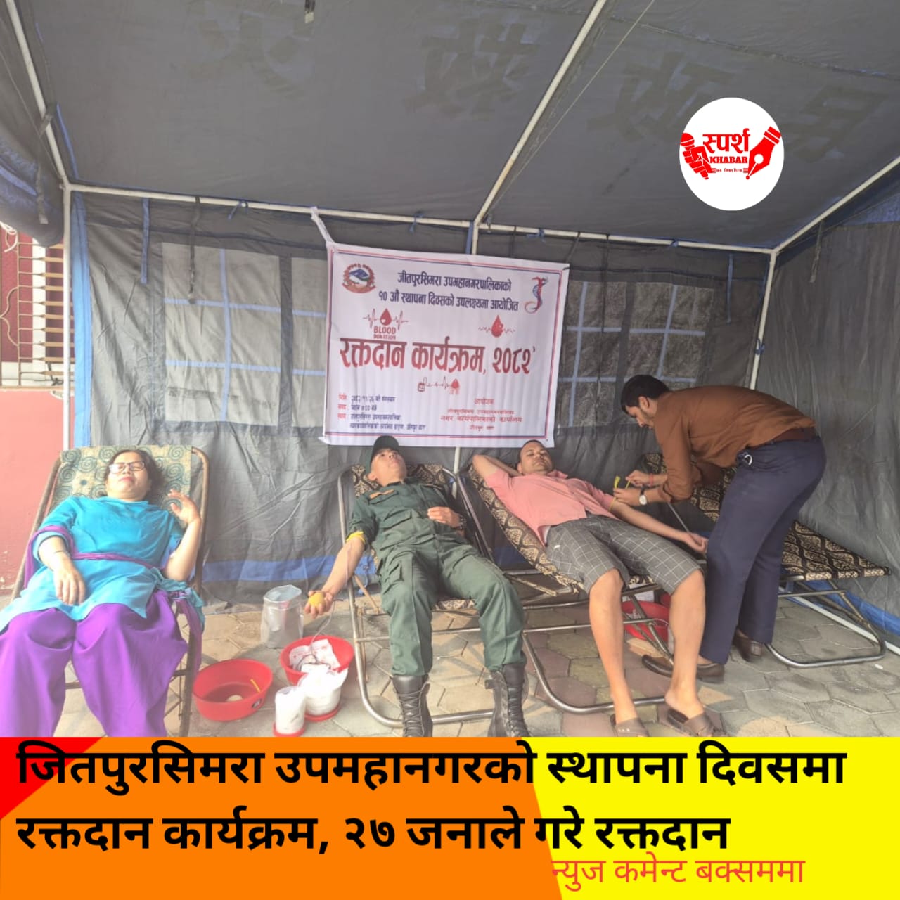 जितपुरसिमरा उपमहानगरपालिकाको दशौँ स्थापना दिवसको उपलक्ष्यमा आयोजित रक्तदान कार्यक्रममा २७ जनाले रक्तदान गरेका छन्। सामाजिक उत्तरदायित्वलाई ध्यानमा राख्दै आयोजना गरिएको उक्त कार्यक्रममा स्थानीय युवाहरु तथा विभिन्न संघ–संस्थाका प्रतिनिधिहरूको सहभागिता रहेको थियो।